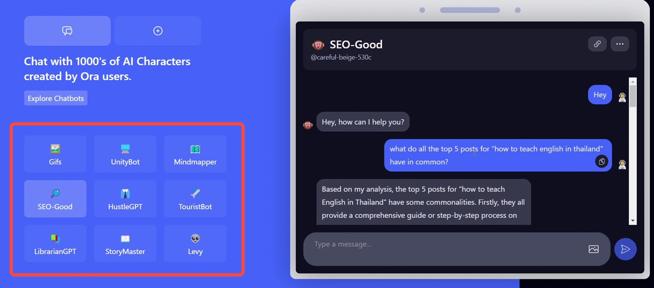 Ora允许用户创建自己的个性AI,并且这些AI均可被共享使用。官网介绍目前用户创建的AI机器人数量达35000+,这意味着你可以从这些聊天机器人中获取更多无法从Chat GPT了解到的信息。