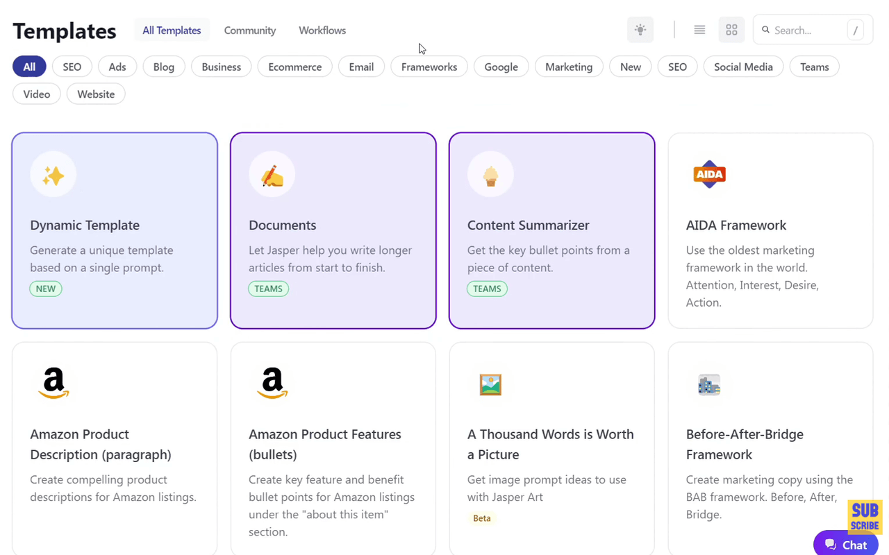 当用户点击“Create new content”——“New from template”时,可以获取不同的模板来创建不同类型内容,如有亚马逊产品描述、Facebook广告等内容模板,这使得获取文本内容更加便捷,大幅提升工作效率。