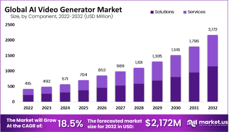 随着AI大模型和多模态AI技术的融合发展,人工智能生成内容的创作能力、通用化能力以及工业化水平快速提升。有据数据表明,2022年AI视频生成工具的市场价值为4.15亿美元,预计到2032年将达到21.72亿美元。2023年至2032年期间,复合年增长率(CAGR) 为18.5%,是一个快速发展的领域。