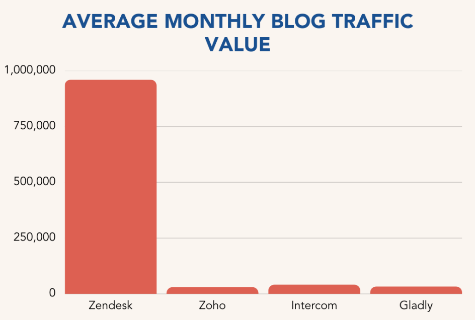通过下图我们可以看到,在网站blog月自然流量方面,Zendesk可以说是断崖式领先,足足领先了竞争对手7倍左右。