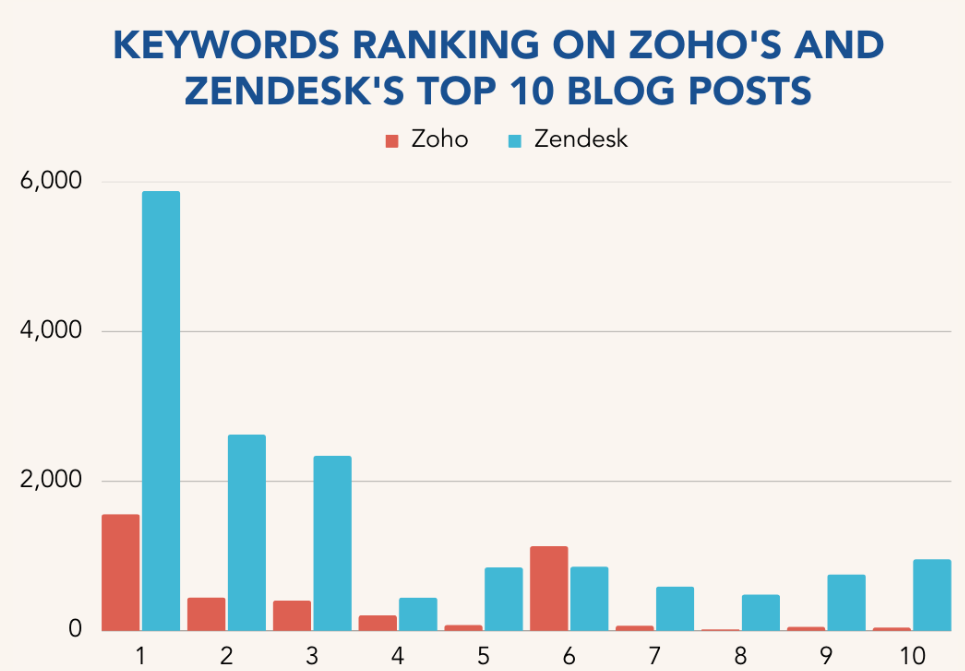 所以我们就比较了Zoho和Zendesk流量前十的文章,都分别在多少个关键词上有排名。由下图可知,Zendesk几乎所有的热门文章都比Zoho覆盖的关键词要多。这也似乎是Zendesk所有文章的一大特点——广泛的关键词覆盖。